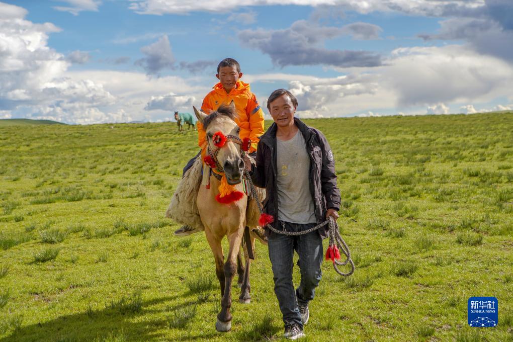 列熱覺(jué)旦騎著(zhù)馬,他的父親次扎達牽著(zhù)馬行走在草原上(8月9日攝)。