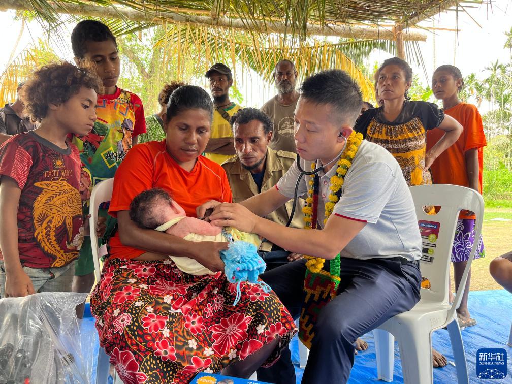 8月5日,在巴布亞新幾內亞中央省的一個(gè)村莊里,第12批援巴新中國醫療隊副隊長(cháng)、新生兒科副主任醫師劉振球為泰樂(lè )聽(tīng)診檢查。