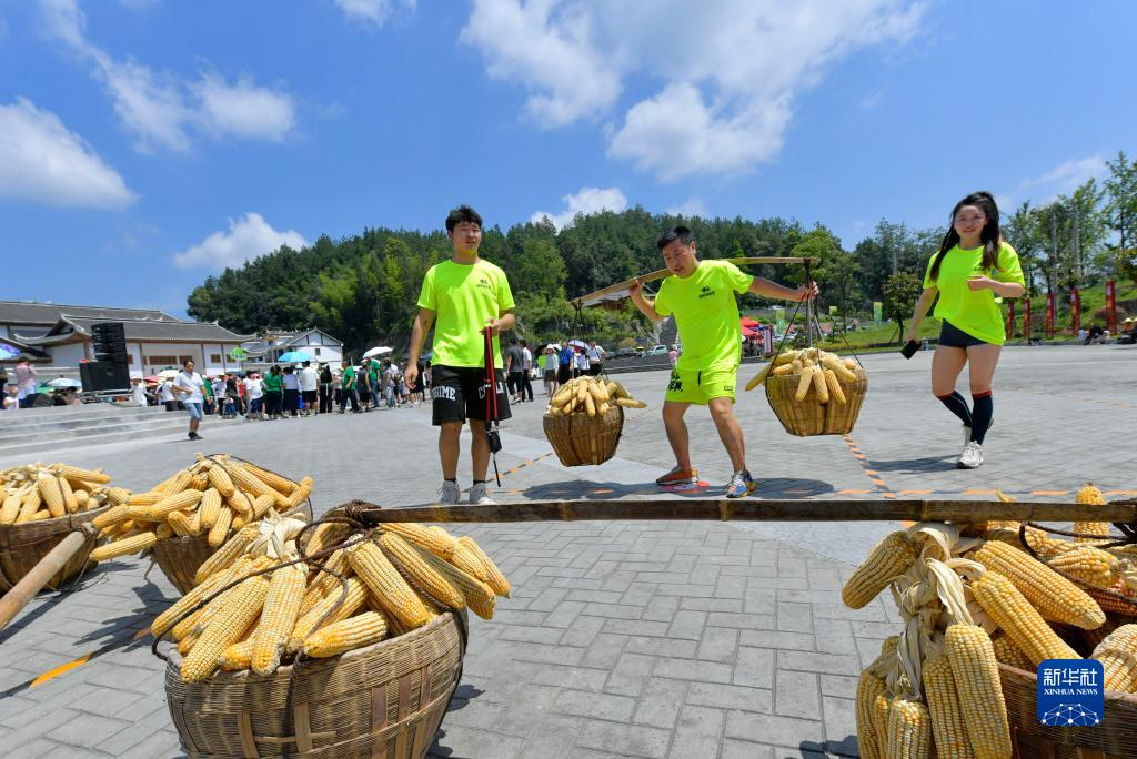 8月12日,游客在宣恩縣椒園鎮黃坪村的景區趣味運動(dòng)會(huì )上體驗挑玉米。