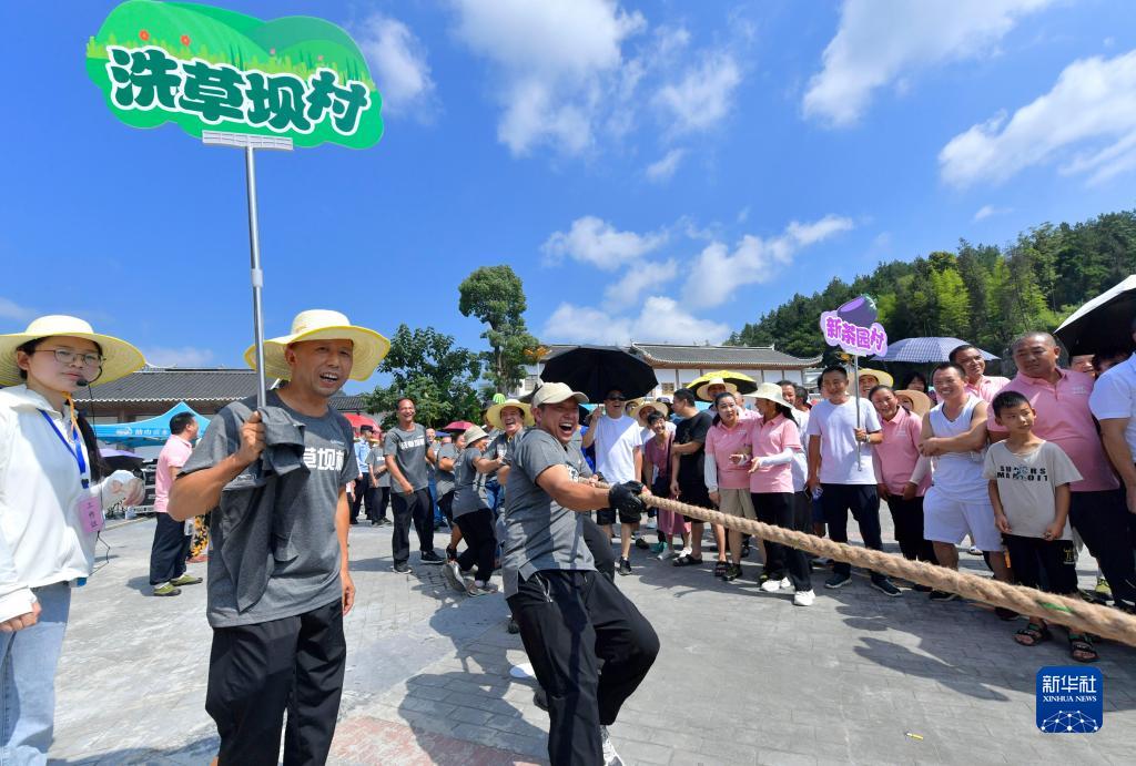 8月12日,人們在宣恩縣椒園鎮黃坪村的景區趣味運動(dòng)會(huì )上參加拔河比賽。