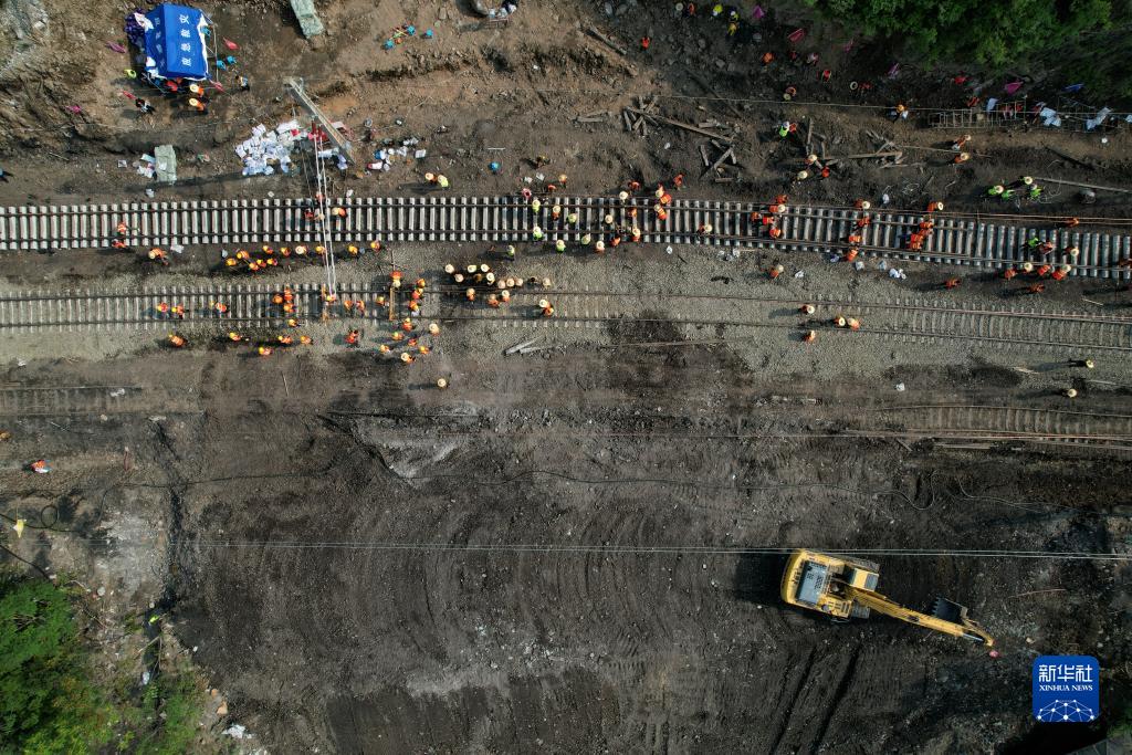 這是8月8日拍攝的豐沙線(xiàn)搶修現場(chǎng)(無(wú)人機照片)。