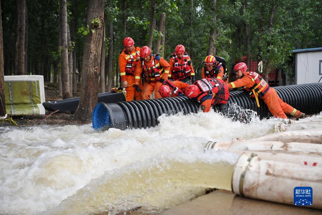 8月6日,在河北省涿州市刁窩鎮東張村,唐山消防救援支隊隊員在進(jìn)行排澇作業(yè)。