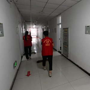 8月12日,在天津市靜海區大邱莊中學(xué)集中安置點(diǎn),志愿者在打掃樓道衛生。