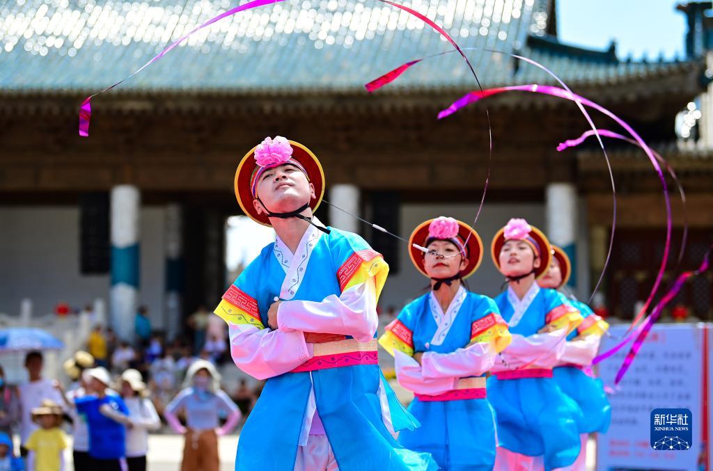 8月13日,在鄂爾多斯文化產(chǎn)業(yè)園景區,非遺傳承人表演朝鮮族象帽舞。