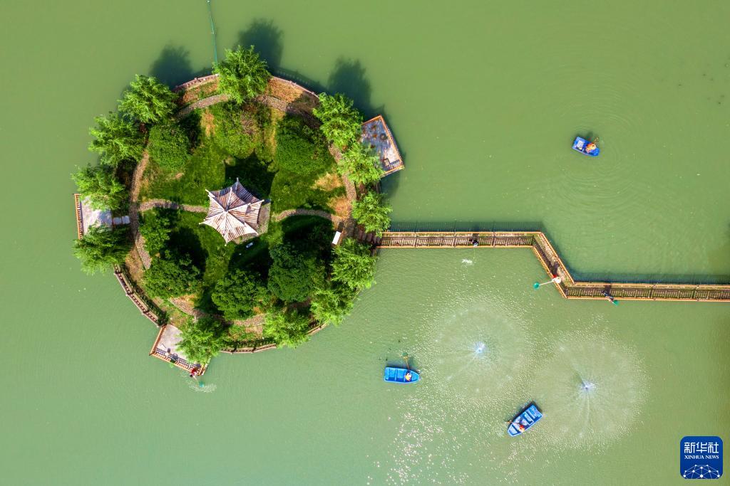 8月13日,在浙江省湖州市長(cháng)興縣和平鎮橫山村,工作人員乘船打撈水面漂浮物(無(wú)人機照片)。