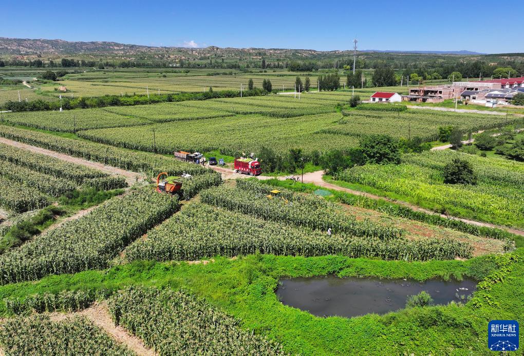 8月13日,在張家口市萬(wàn)全區盆窯村鮮食玉米種植基地,農民收獲鮮食玉米(無(wú)人機照片)。