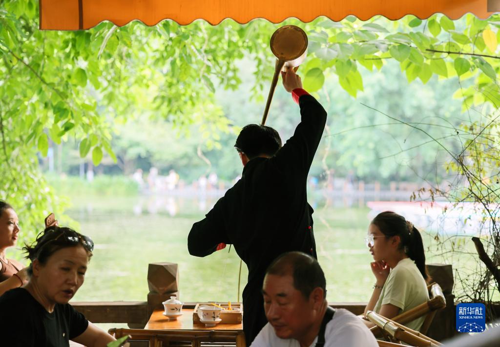摻茶師傅為客人表演“一帆風(fēng)順”(8月7日攝)。