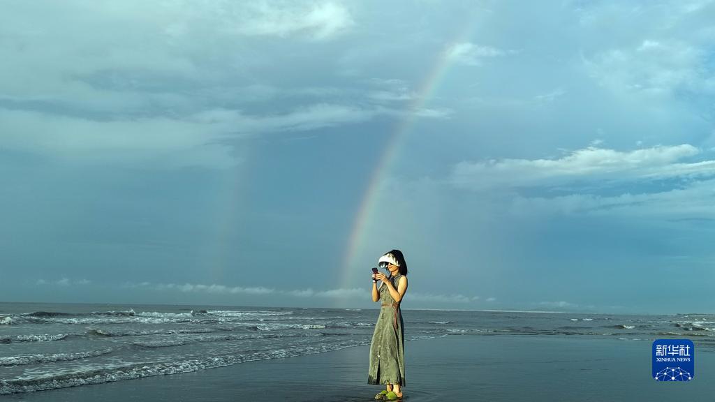 8月14日,游客在金灘出現的彩虹下游玩。