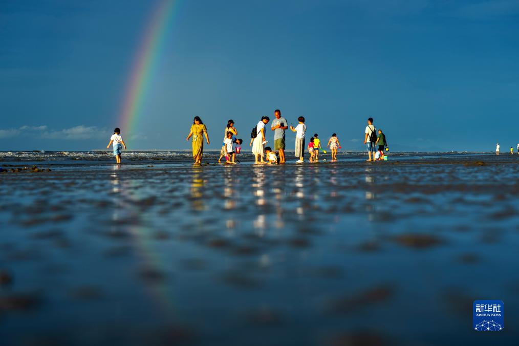 8月14日,游客在金灘出現的彩虹下游玩。