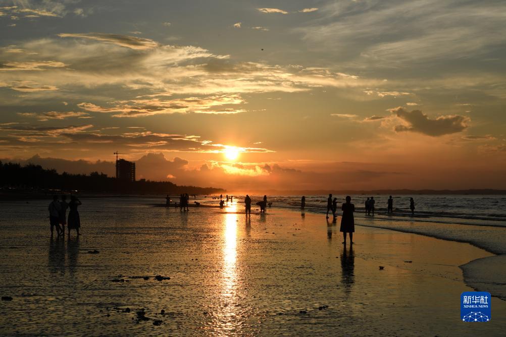 8月14日,日出時(shí)分,游客在金灘游玩。