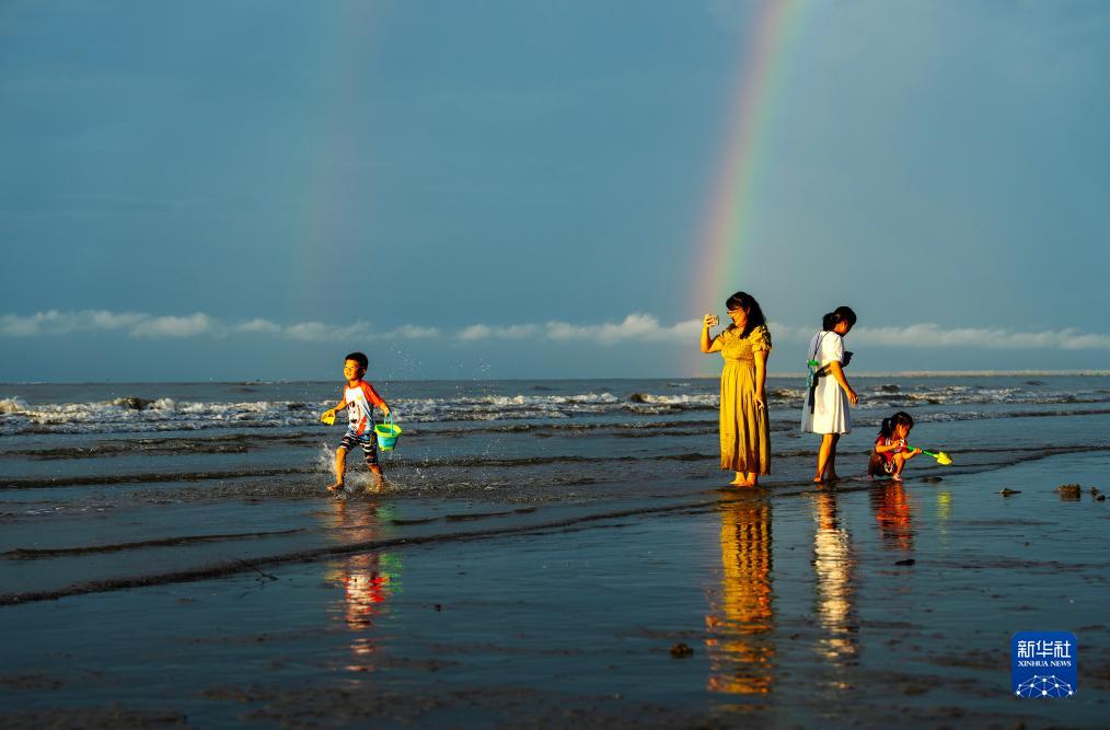 當日,一場(chǎng)晨雨過(guò)后,日出時(shí)分,在廣西東興的金灘,“國道之行 從雪山奔向大?!眻蟮澜M偶遇了朝陽(yáng)與彩虹“共舞”的奇妙景觀(guān)。