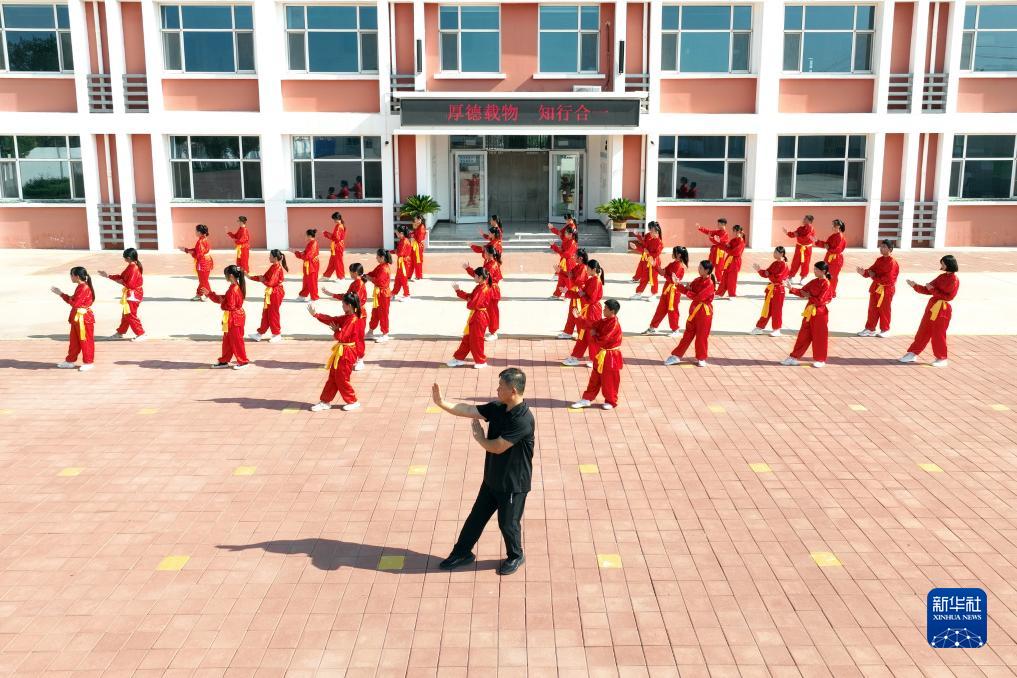 8月14日,在河北省滄州市滄縣汪家鋪鎮董辛莊小學(xué),老師帶領(lǐng)學(xué)生習練武術(shù)(無(wú)人機照片)。