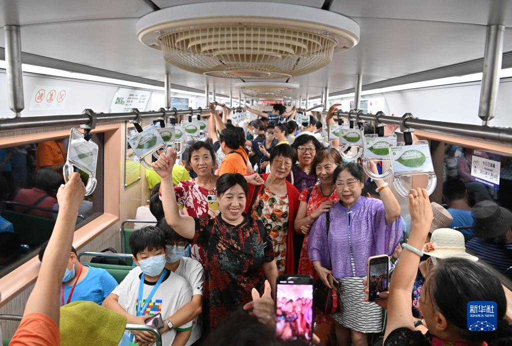 從8月8日起,北京地鐵一號線(xiàn)開(kāi)行“時(shí)光列車(chē)”,6節車(chē)廂采用不同時(shí)代涂裝風(fēng)格。特別是綠色座椅、車(chē)廂頂部風(fēng)扇等元素,帶領(lǐng)乘客瞬間“穿越”,吸引人們紛紛打卡拍照?!皶r(shí)光列車(chē)”運行時(shí)間是工作日14點(diǎn)至15點(diǎn),運行區間是地鐵古城站至地鐵復興門(mén)站。