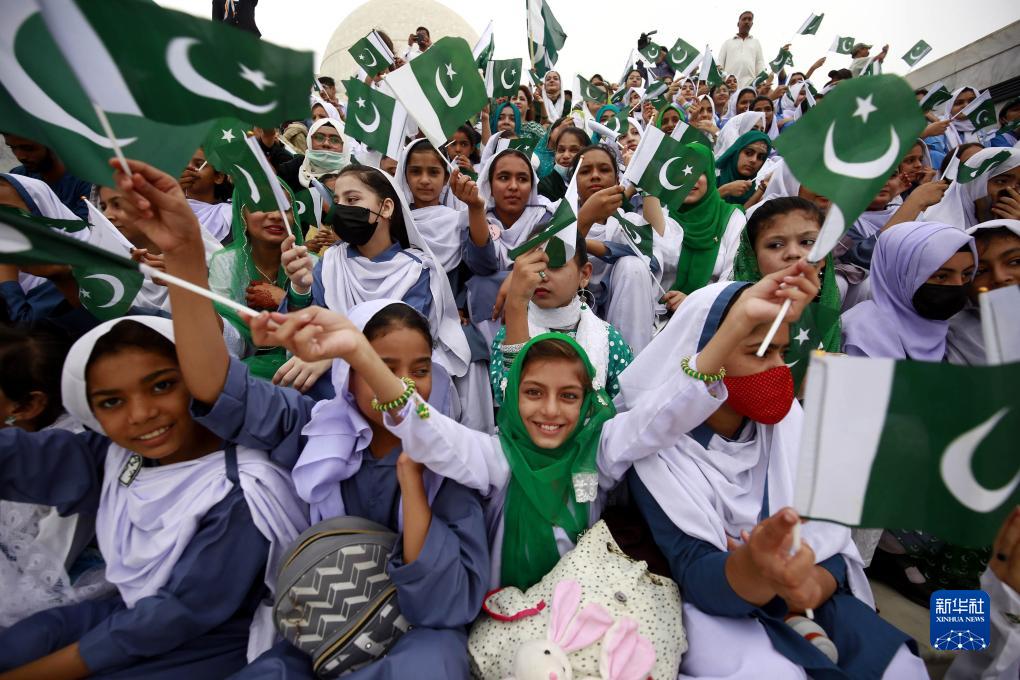 8月14日,在巴基斯坦卡拉奇,當地學(xué)生參加巴基斯坦獨立76周年慶?;顒?dòng)。