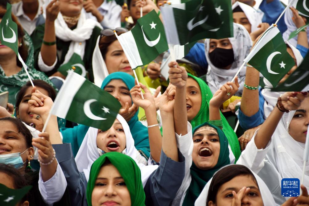 8月14日,在巴基斯坦卡拉奇,當地學(xué)生參加巴基斯坦獨立76周年慶?;顒?dòng)。