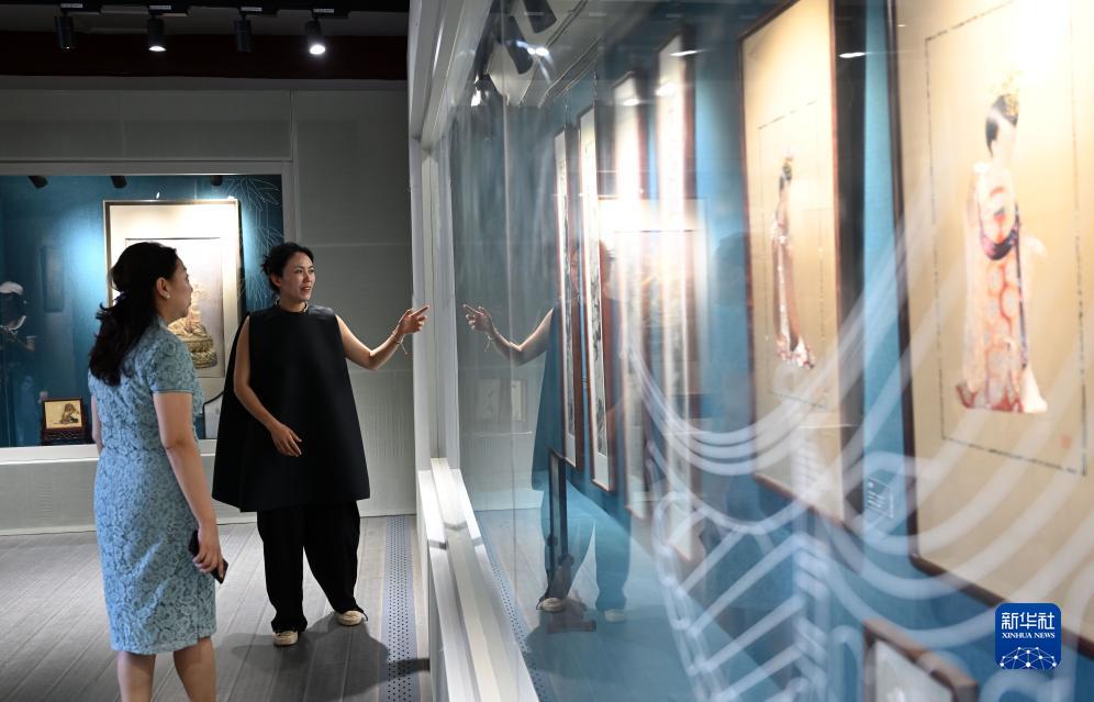 8月14日,北京服裝學(xué)院副教授沈華菊(右)向嘉賓介紹展出的蘇繡。