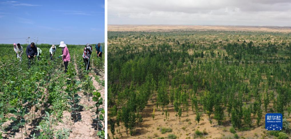 這是一張拼版照片。左圖為內蒙古杭錦旗什拉召治沙站的工作人員在苗圃中除草(7月22日攝);右圖為內蒙古杭錦旗什拉召治沙站種植的庫布其沙漠鎖邊林(7月22日攝,無(wú)人機照片)。20世紀50年代開(kāi)始,國營(yíng)林場(chǎng)什拉召治沙站開(kāi)始植樹(shù)治沙,三代治沙人在庫布其沙漠北緣營(yíng)造了長(cháng)48公里、面積12萬(wàn)多畝的鎖邊林帶,有效遏制了沙漠向北擴張。
