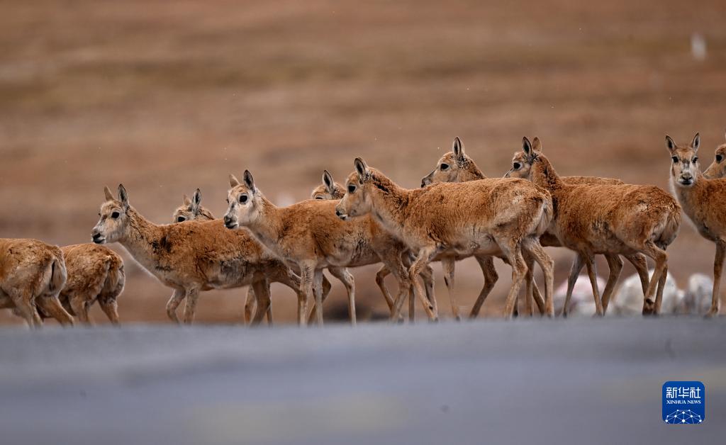 一群待產(chǎn)雌性藏羚羊在通過(guò)青藏公路前往可可西里卓乃湖產(chǎn)仔(5月28日攝)。