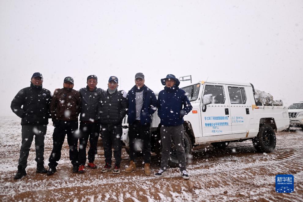 可可西里管理處卓乃湖保護站巡山隊員更卻羅周、尕瑪成林、郭雪虎、才索加、更松多杰、尕瑪扎西(從左至右)在前往可可西里卓乃湖保護站的途中留影(6月16日攝)。
