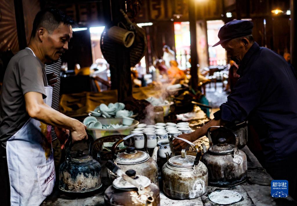 茶館里的伙計在工作(8月7日攝)。