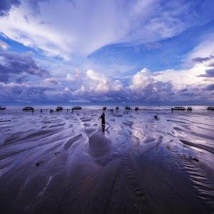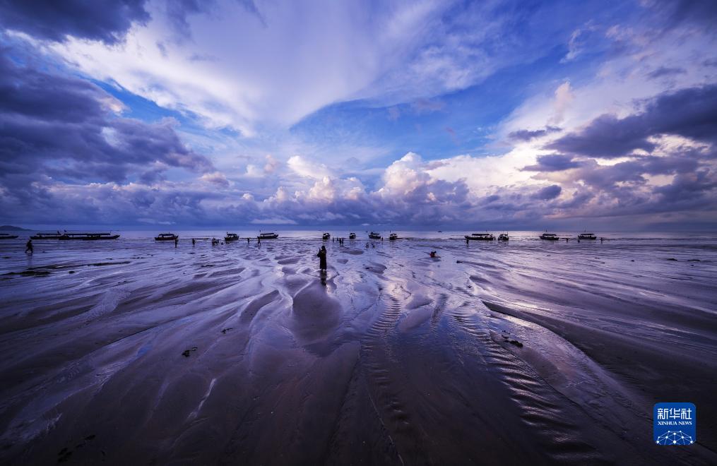 清晨,迅速變化的光線(xiàn)和云彩、來(lái)來(lái)往往的游客、聞雞起舞的漁人以及奔騰不息的波浪,在廣西東興的金灘上一起奏響了一首美妙的樂(lè )曲。