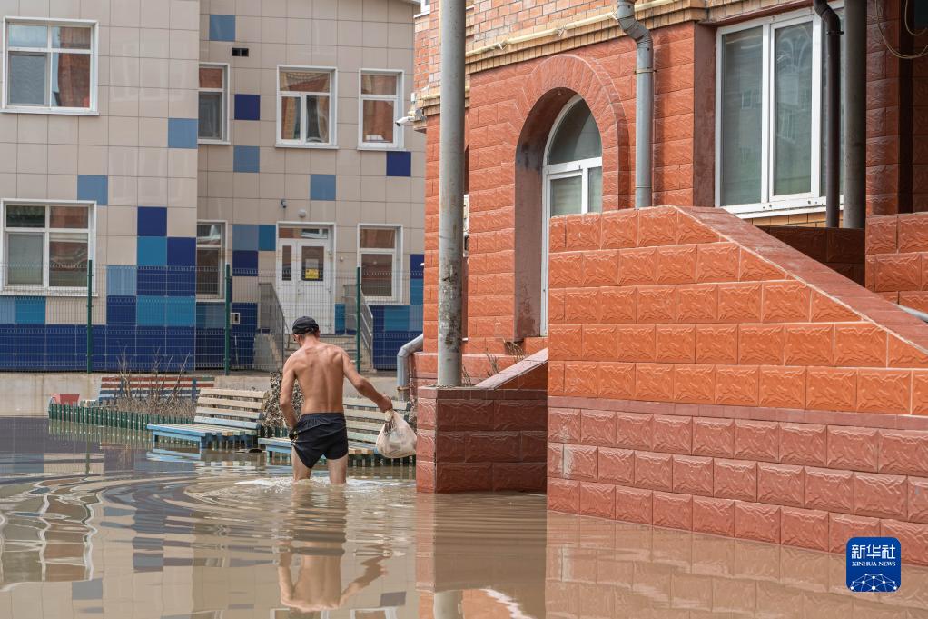 8月15日,在俄羅斯烏蘇里斯克市,一名男子在洪水中行走。