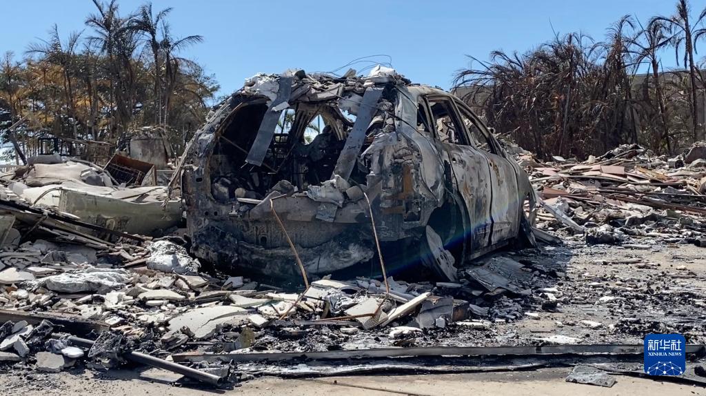 這是8月14日在美國夏威夷州毛伊島拉海納拍攝的野火燒毀的建筑和汽車(chē)殘骸。