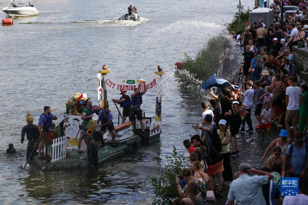 當日,“浴缸劃船節”在比利時(shí)迪南舉行。該活動(dòng)始于1982年,已成為比利時(shí)熱鬧的夏季節慶活動(dòng)之一。今年的“浴缸劃船節”主題為“默茲河上的農場(chǎng)”,參加者圍繞浴缸打造稀奇古怪的船只,比拼設計創(chuàng )意及現場(chǎng)表演。