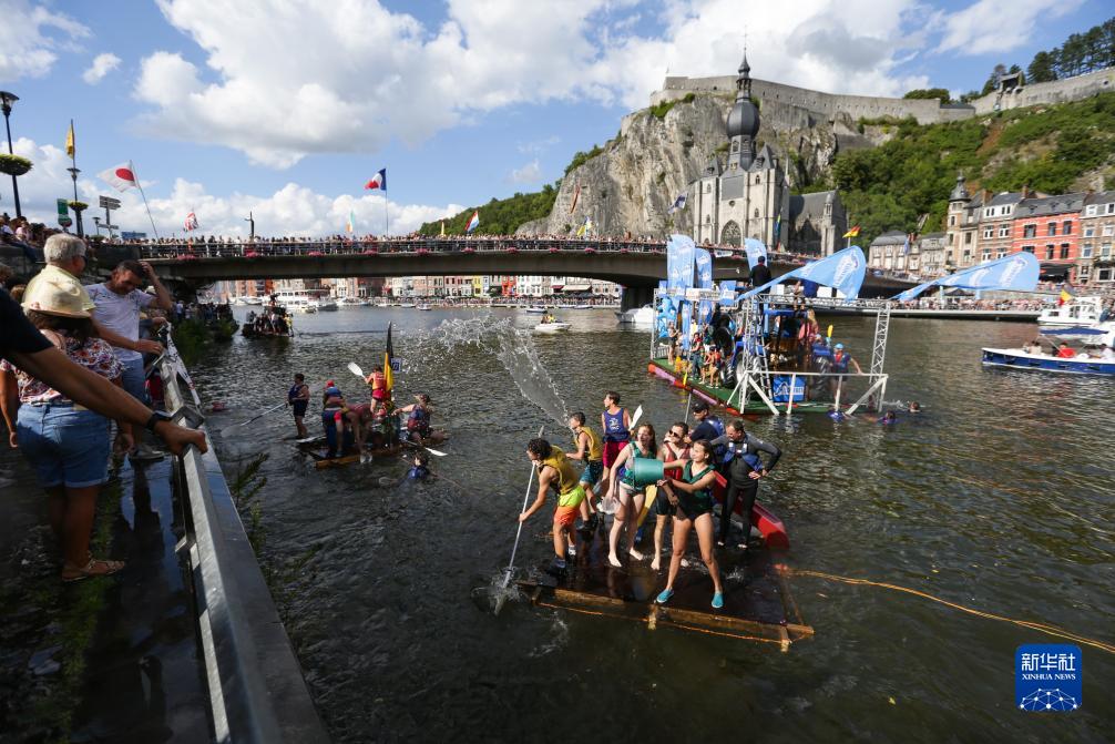 8月15日,在比利時(shí)南部小城迪南的默茲河上,參加者在“浴缸劃船節”上向觀(guān)眾潑水互動(dòng)。