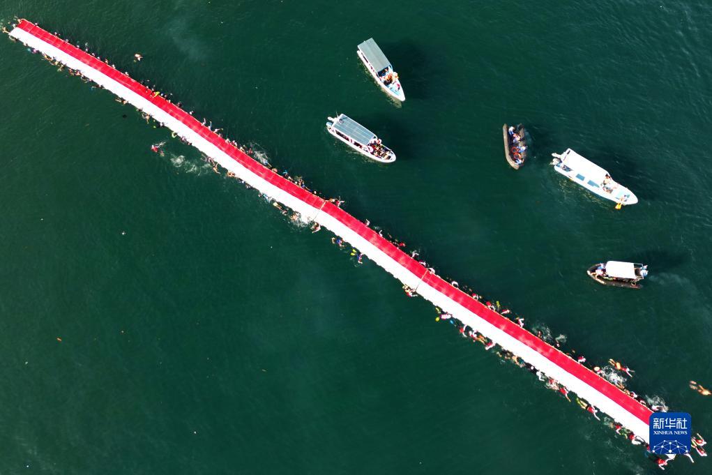 8月12日,在印度尼西亞望加錫海邊,人們游泳展開(kāi)一張長(cháng)達78米的巨幅印尼國旗(無(wú)人機照片)。