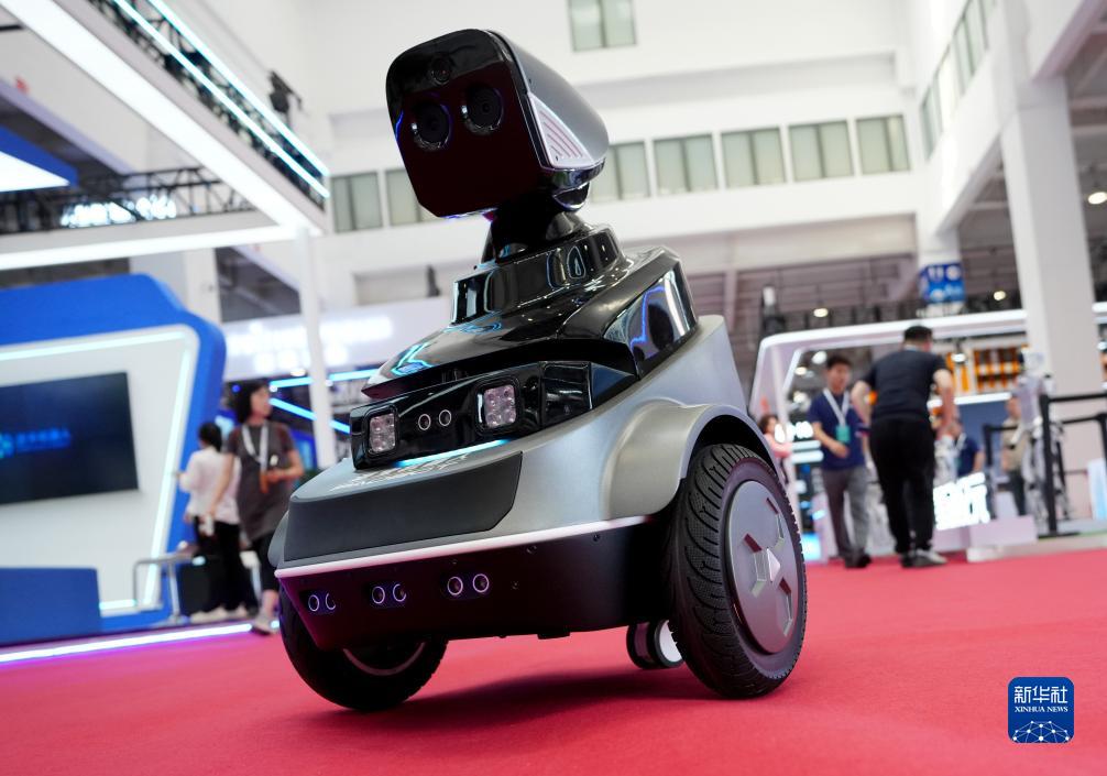 8月16日,在2023世界機器人大會(huì )現場(chǎng),具有防火防盜功能的巡邏機器人在執勤。