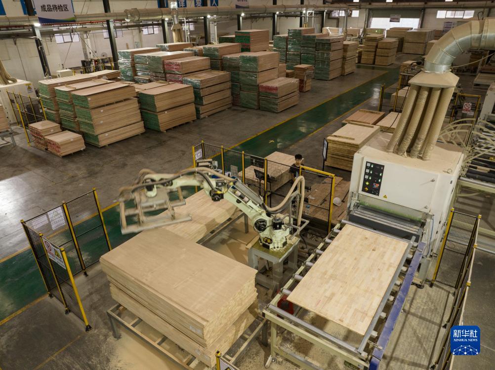 8月14日,在江西省贛州市南康家具智能備料中心的自動(dòng)砂光區,機器人自動(dòng)搬運木料進(jìn)行加工。