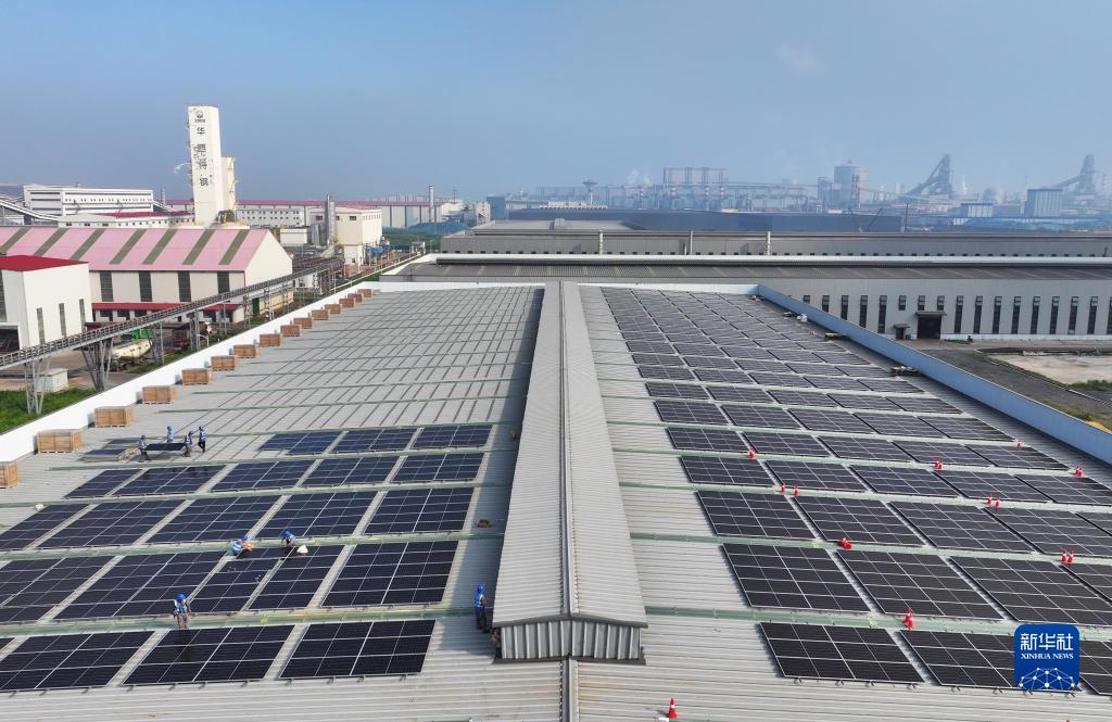 8月16日,工人在唐山市海港經(jīng)濟開(kāi)發(fā)區一企業(yè)的廠(chǎng)房屋頂安裝太陽(yáng)能光伏發(fā)電板(無(wú)人機照片)。
