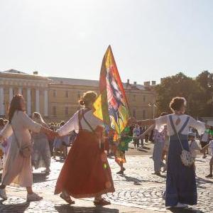 8月15日,民眾在俄羅斯圣彼得堡冬宮廣場(chǎng)跳圓圈舞。