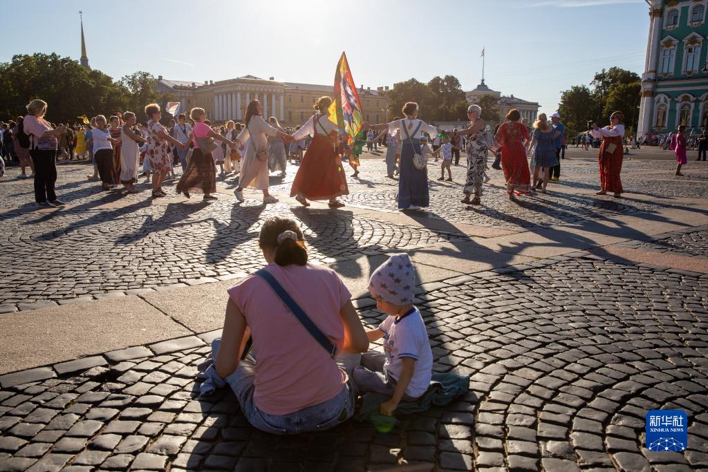 第七屆“俄羅斯圓圈舞”國際藝術(shù)節15日在俄羅斯和獨聯(lián)體國家上百座城市舉行,其中主場(chǎng)在俄羅斯第二大城市圣彼得堡。當天傍晚,數千人聚集到圣彼得堡冬宮廣場(chǎng),手拉手圍成圓圈起舞。