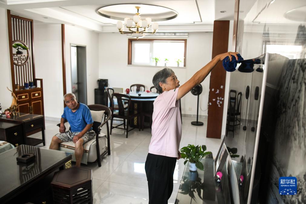 8月15日,馬山鎮居民尹遜河(右)在自家拆遷安置新房?jì)却驋咝l生。