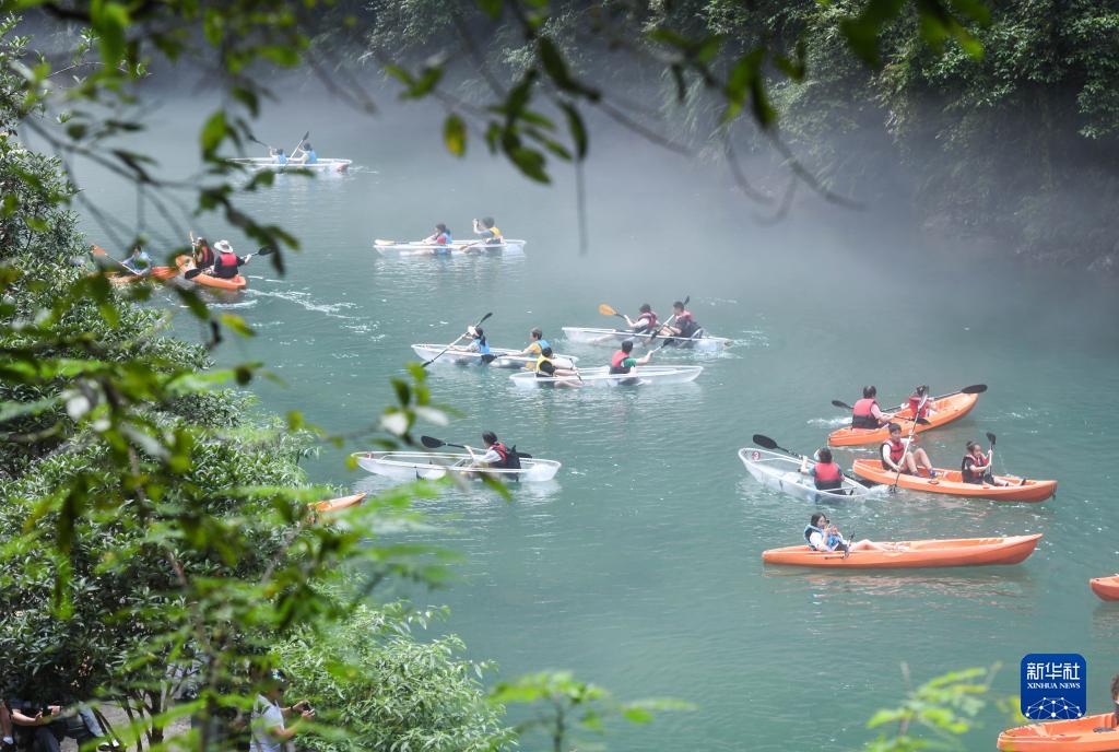 湖北省恩施土家族苗族自治州鶴峰縣森林覆蓋率高,空氣清新,氣候宜人。位于該縣容美鎮的屏山峽谷,全長(cháng)約18公里,峰巒與河谷高差達千米,最窄處僅五尺,形成罕見(jiàn)的峽谷和地縫特色風(fēng)光,碧水、輕舟與絕壁、森林相映成趣,每年吸引眾多海內外游客前來(lái)觀(guān)光。