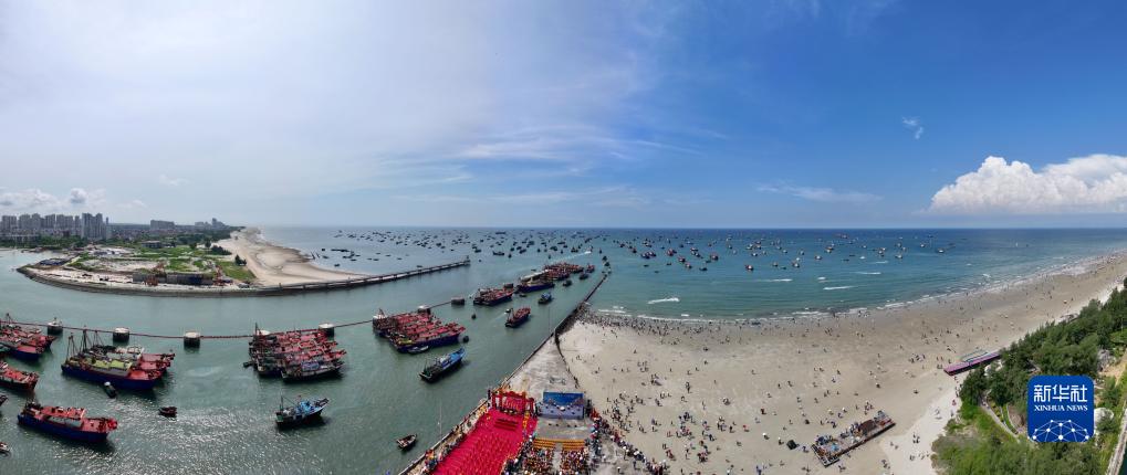8月16日,游人在北海市僑港鎮電建漁港碼頭的出??谟^(guān)賞漁船出港的壯觀(guān)場(chǎng)景(無(wú)人機全景照片)。