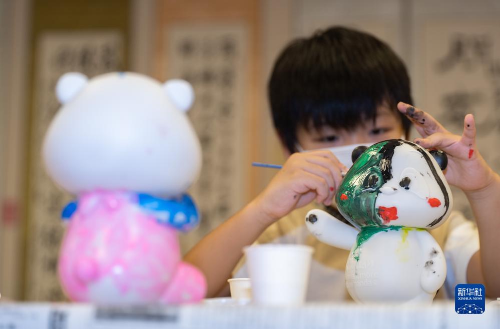 8月16日,在日本東京中國文化中心,一名兒童制作屬于自己的彩色大熊貓玩偶。