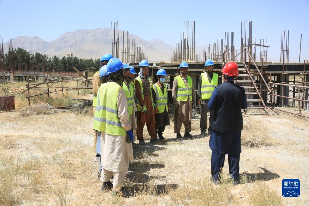 8月13日,努爾·阿齊茲(右一)在喀布爾西郊一處中企承建項目工地指導當地工人工作。