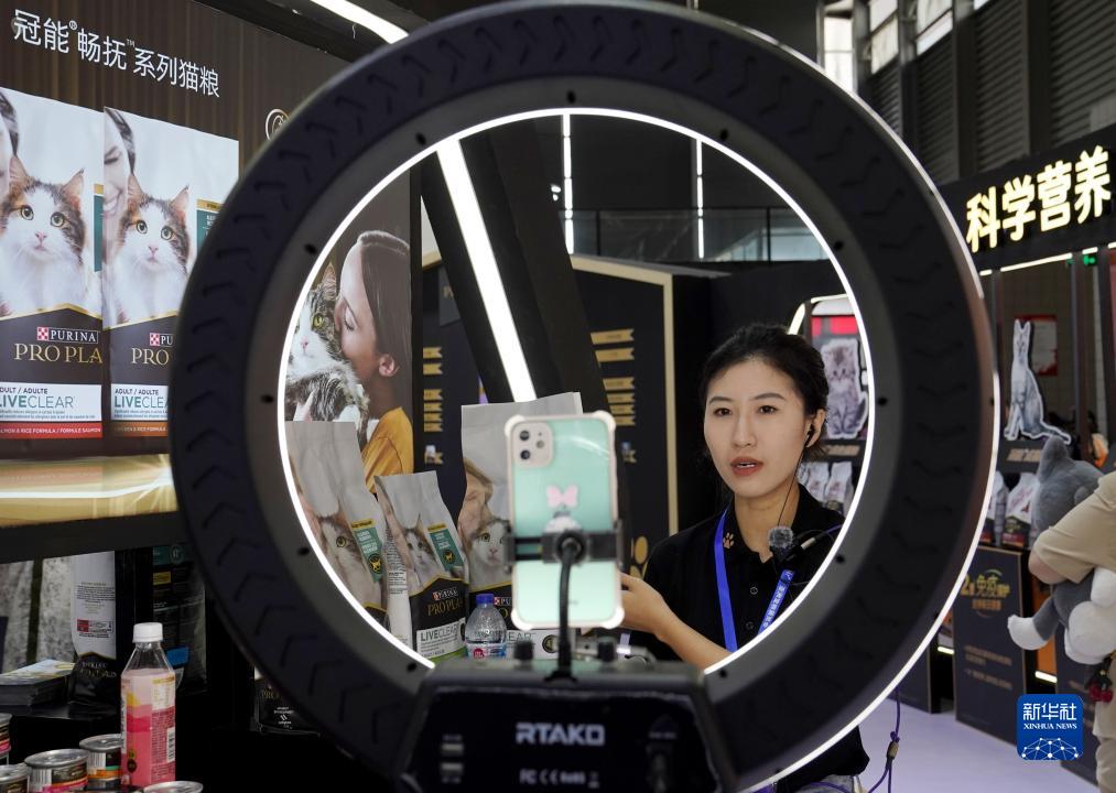 8月16日,在第25屆亞洲寵物展覽會(huì )寵物食品館,展臺人員在進(jìn)行在線(xiàn)直播。