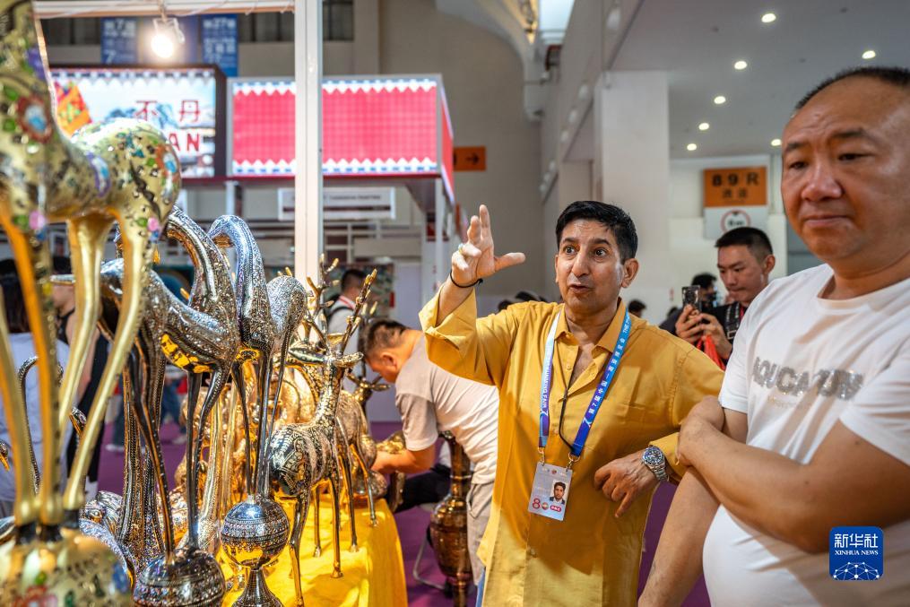 8月16日,參展商(左)在第七屆中國—南亞博覽會(huì )巴基斯坦展區推介特色商品?! ⌒氯A社記者 胡超 攝