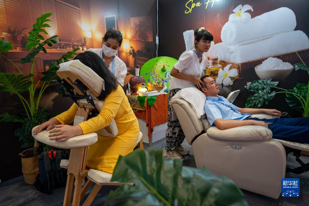 8月16日,參觀(guān)者在第七屆中國—南亞博覽會(huì )東南亞館體驗泰式按摩?! ⌒氯A社記者 陳欣波 攝
