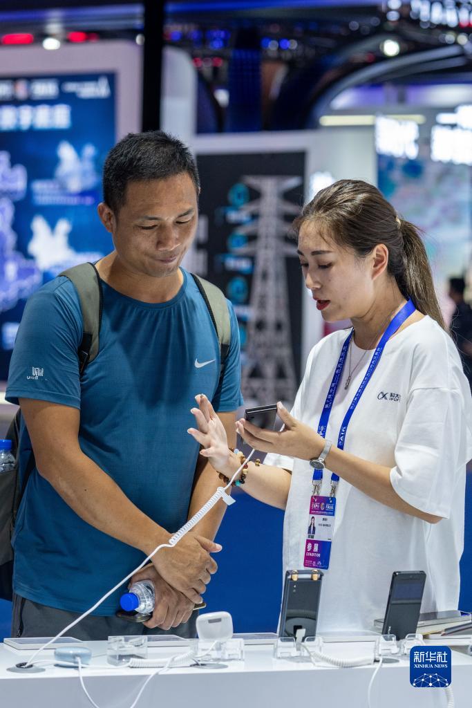 8月16日,來(lái)自廣東的客商(左)在第七屆中國—南亞博覽會(huì )科大訊飛展位了解翻譯設備?! ⌒氯A社記者 胡超 攝