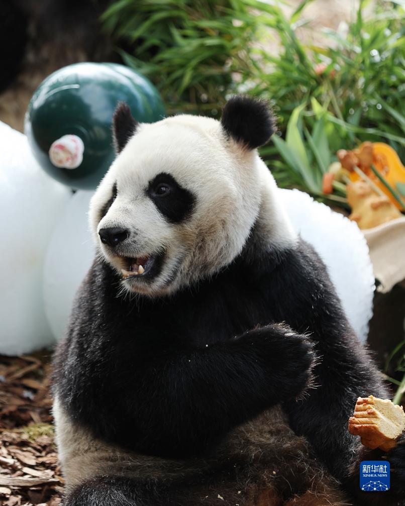 8月16日,在比利時(shí)布呂熱萊特的天堂動(dòng)物園,大熊貓“寶妹”享用“生日大餐”。