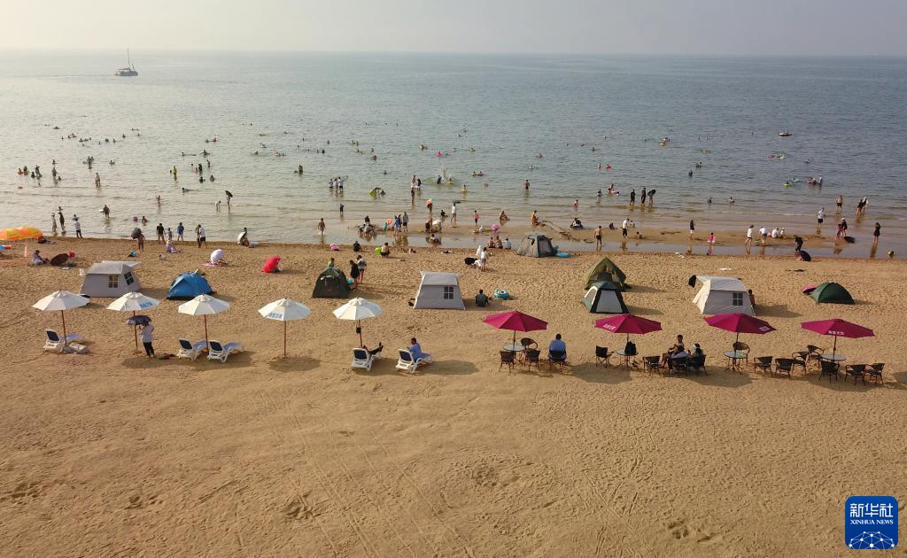 8月16日,游客在山東省萊州市三山島的海濱風(fēng)景區游玩(無(wú)人機照片)。