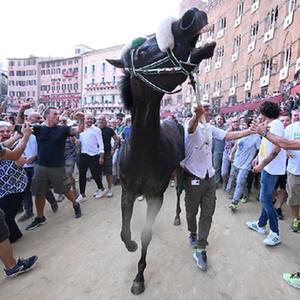 8月16日,在意大利錫耶納,人們聚集在獲勝馬匹周?chē)?/p>