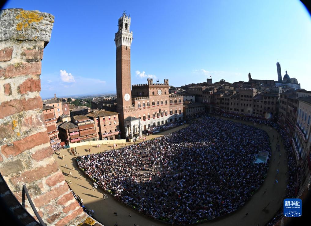 當日,錫耶納賽馬節在意大利托斯卡納大區古城錫耶納市中心的田野廣場(chǎng)舉行,吸引了眾多觀(guān)眾前來(lái)觀(guān)看。錫耶納賽馬節是世界聞名的意大利傳統民間活動(dòng),始于1656年,每年7月2日和8月16日舉行兩次。