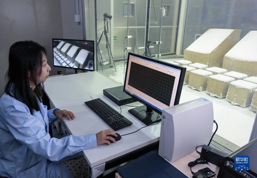 在敦煌研究院多場(chǎng)耦合實(shí)驗室內,一位工作人員觀(guān)察針對鎖陽(yáng)城夯土模型所進(jìn)行的環(huán)境模擬實(shí)驗情況(8月3日攝)。