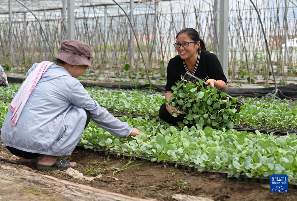 8月16日,余青青(右)在樅陽(yáng)縣青園心家庭農場(chǎng)和工人一起查看菜苗生長(cháng)情況。
